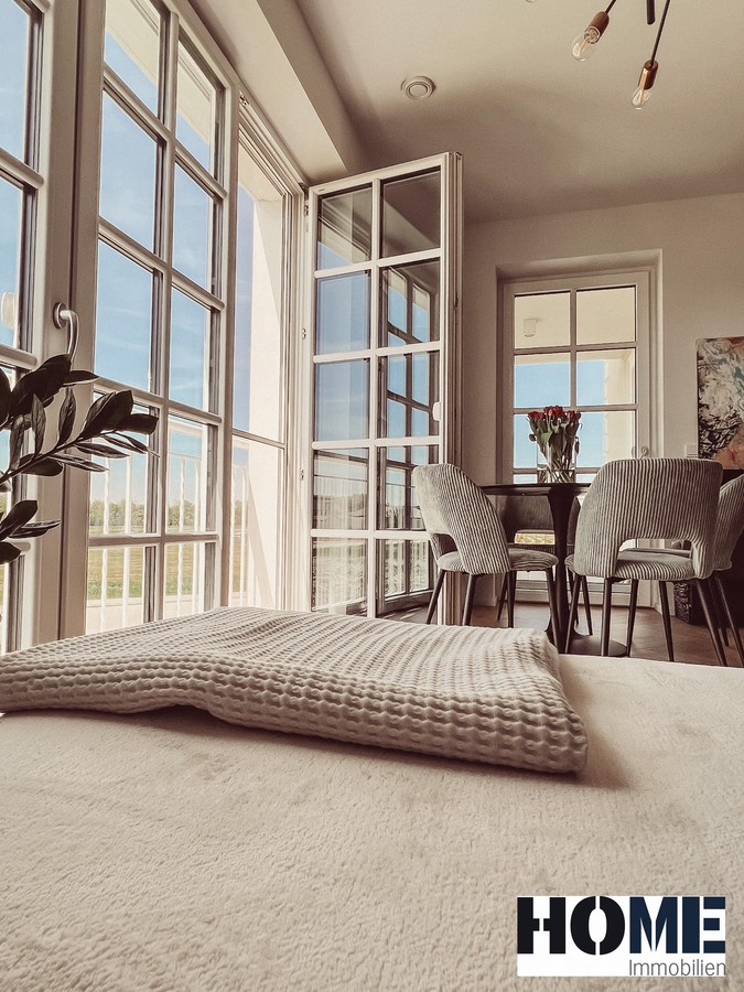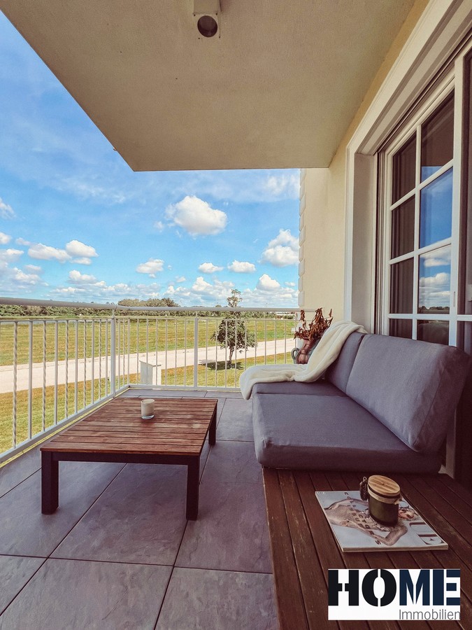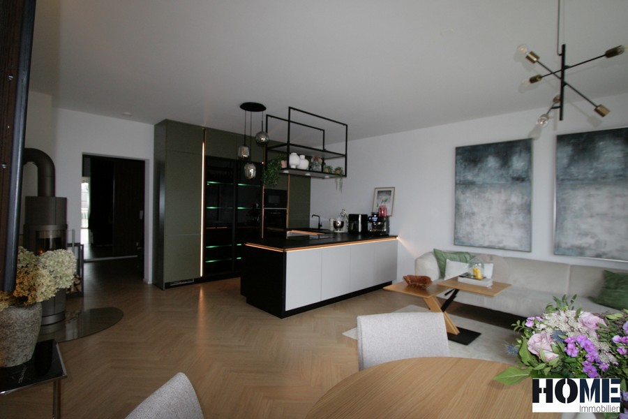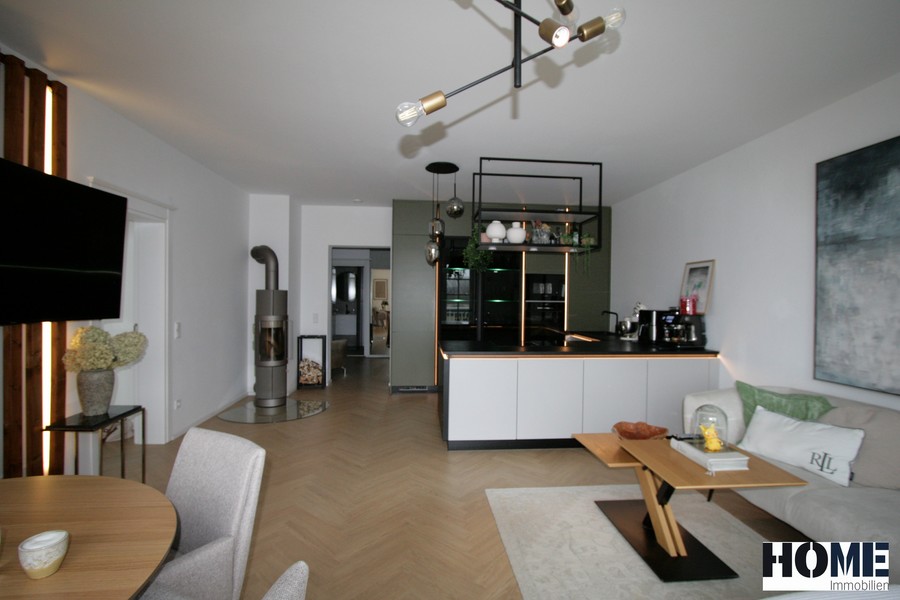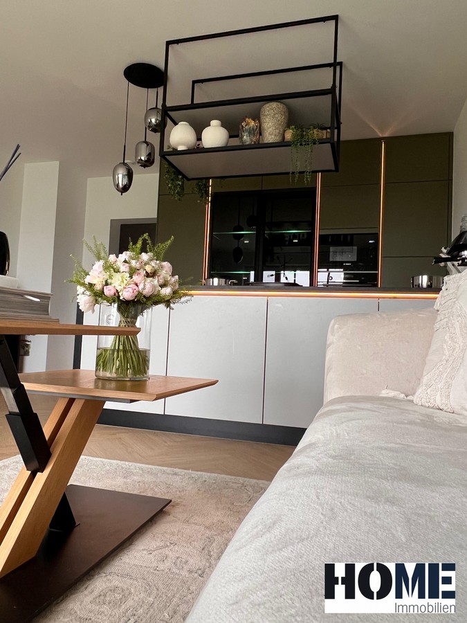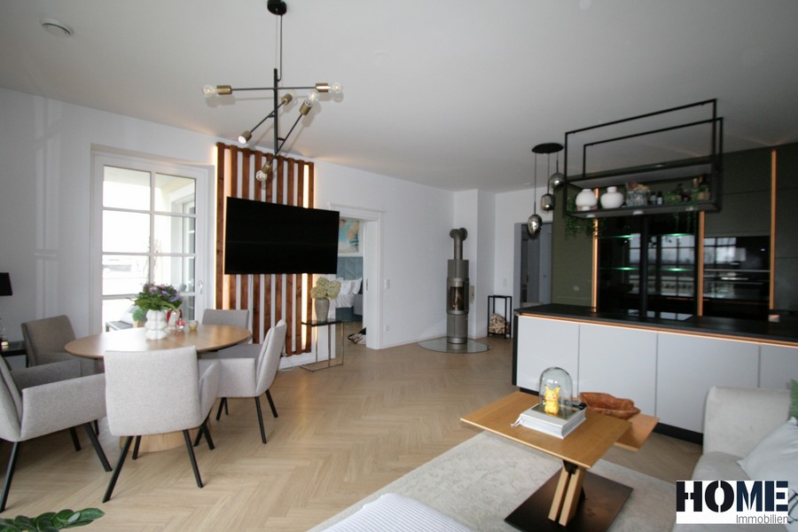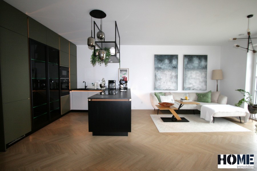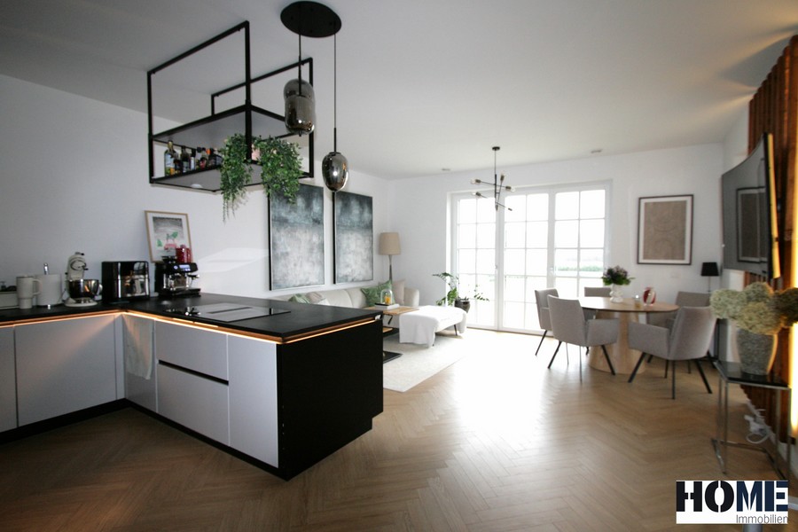 . lichtdurchflutetes Wohnzimmer mit Essbereich, integrierter Markenküche und Zugang auf den ca. 8 m² großen Balkon mit Blick auf den ca.3 Hektar großen Schwimmteich.