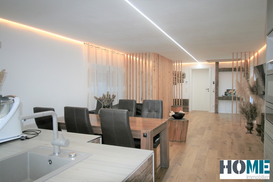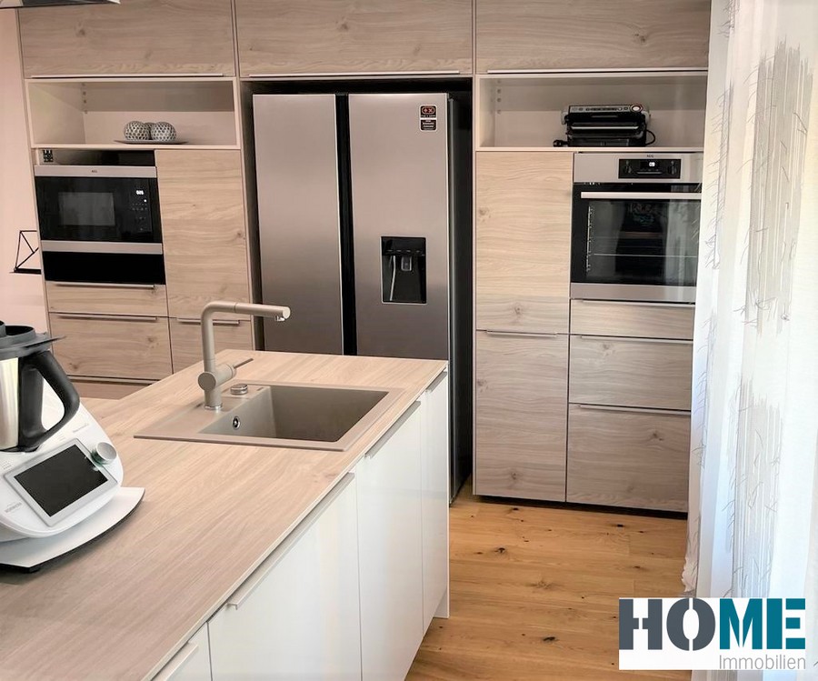 Durch den freundlichen Eingangsbereich, gelangen Sie in das lichtdurchflutete Wohnzimmer mit Essbereich und offener Küche der Marke DIETER KNOLL, Geräten der Marke AEG und DIETER KNOLL(Induktionsherd, Backofen, Einbaumikrowelle, Geschirrspülmaschine) und einer Kochinsel. Der Dunstabzug startet selbständig und die Küche verfügt auch über eine Wärmelade für Ihre Speisen.