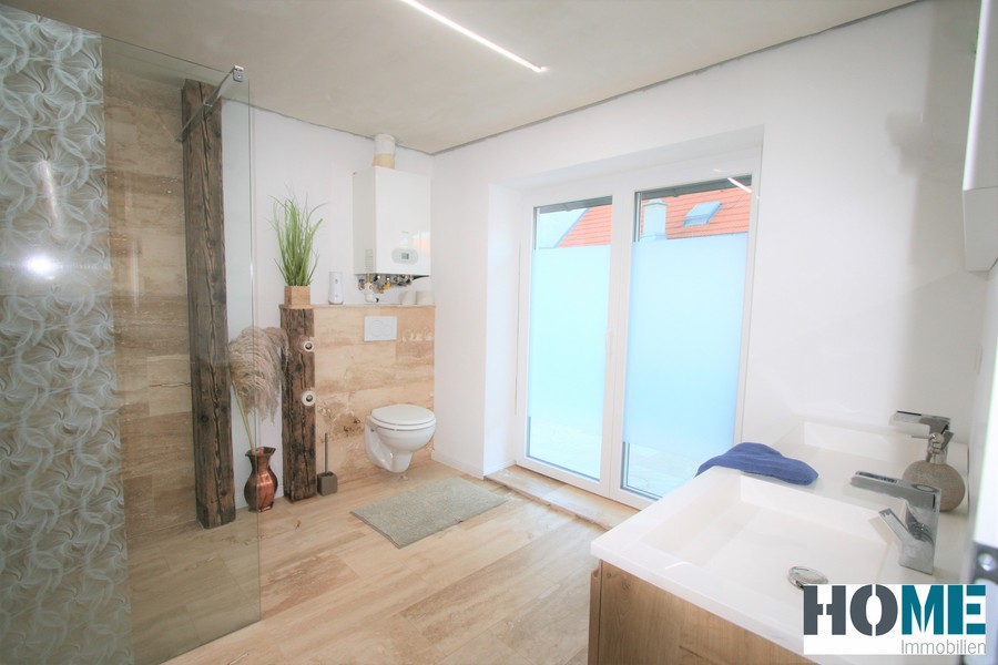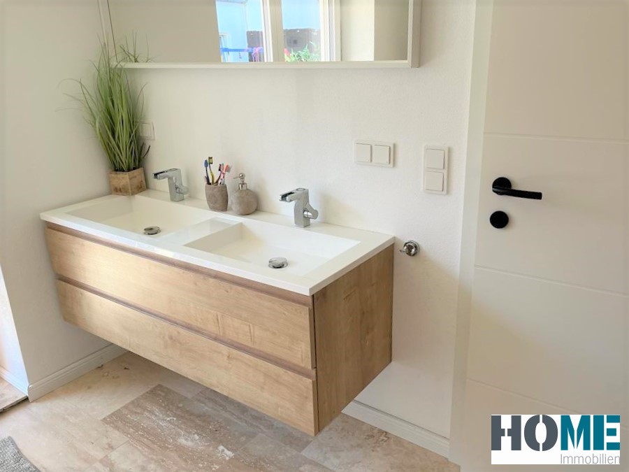 Im EG befindet sich auch ein Badezimmer mit bodenebener Dusche ein Doppelwaschtisch und eine Gästetoilette. Eine Terrassentür bietet die möglichkeit auch in den Garten zu gelangen.