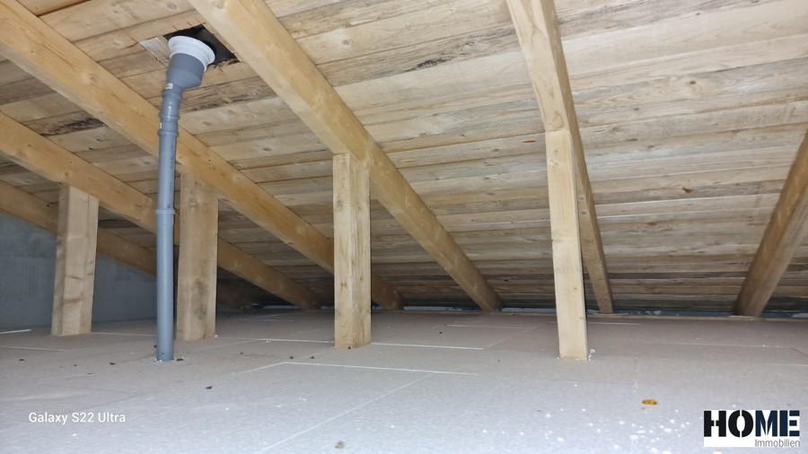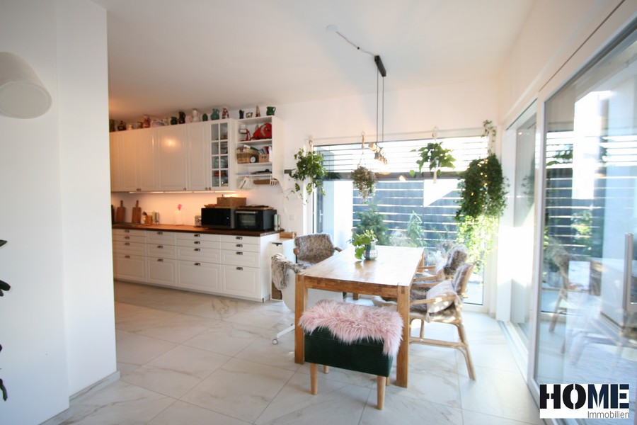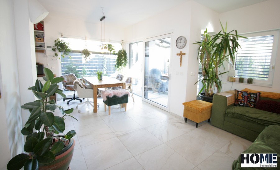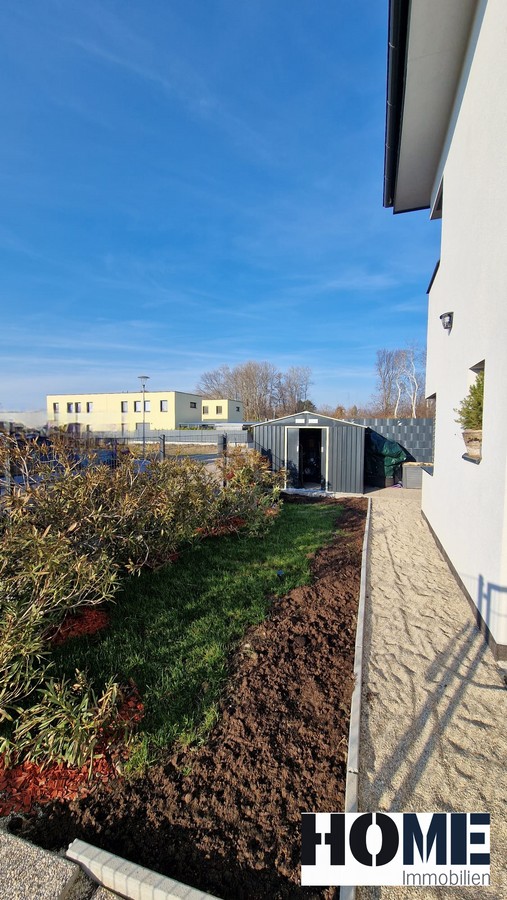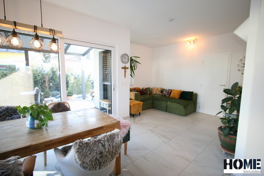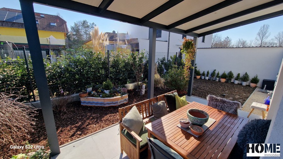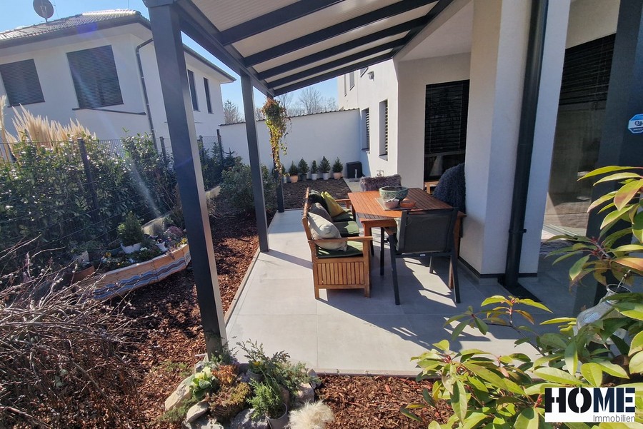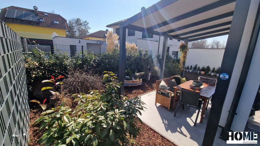 Vom Wohnzimmer gelangen Sie direkt auf die 23 m² große überdachte Terrasse mit Blick in den gepflegten Garten. Der Technikraum im Außenbereich, bietet Platz für Ihre Gartenutensilien.