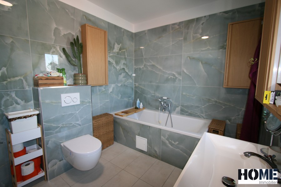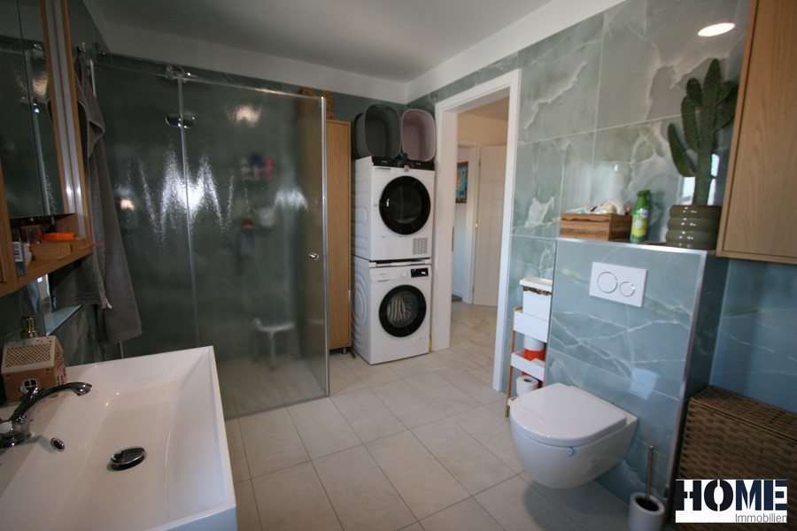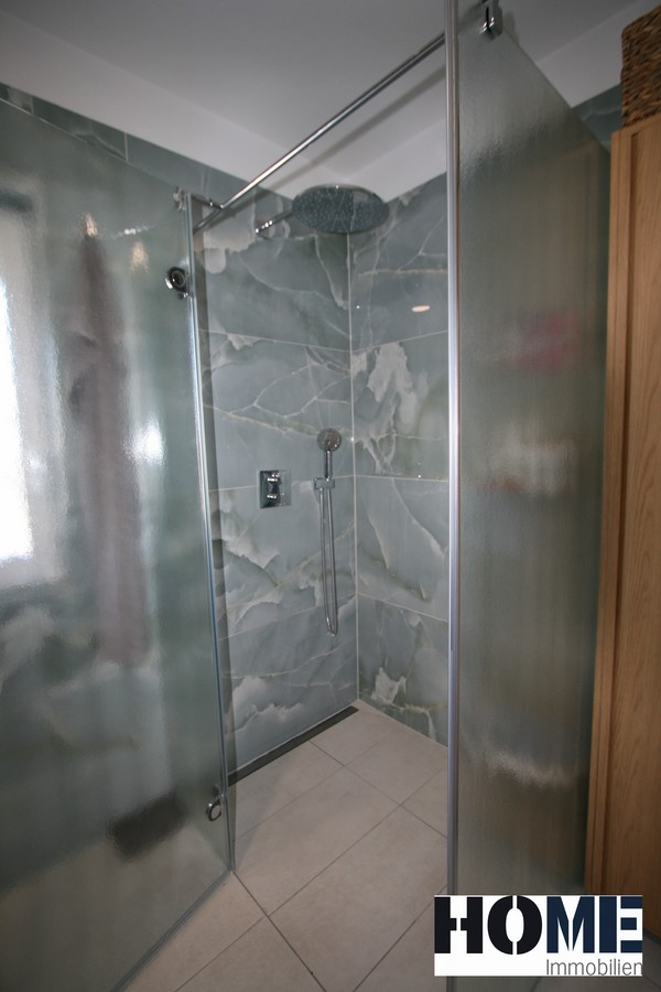 - ein großes elegantes Badezimmer mit Walk-In Dusche, extra großer Badewanne, Doppelwaschtisch, Toilette und WMA